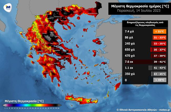 Σύμφωνα με τα προγνωστικά στοιχεία του Εθνικού Αστεροσκοπείου Αθηνών / meteo.gr, κορύφωση του κύματος καύσωνα αναμένεται στη χώρα την Παρασκευή 14/07, με τις μέγιστες να φτάνουν τοπικά τους 42-43 βαθμούς Κελσίου. Αυτό θα έχει ως αποτέλεσμα την έκθεση του μεγαλύτερου μέρους του πληθυσμού σε πολύ υψηλές μέγιστες θερμοκρασίες. Όπως φαίνεται στο Χάρτη 1, περίπου 9 εκατομμύρια άνθρωποι θα βιώσουν θερμοκρασίες άνω των 39 °C εκ των οποίων 1,5 εκατομμύριο άνθρωποι θα βιώσουν θερμοκρασίες άνω των 41 °C. Σημειώνεται, ότι τα δημογραφικά στοιχεία αφορούν του μόνιμους κάτοικους κάθε περιοχής, ενώ οι οποιεσδήποτε μετακινήσεις (π.χ. λόγω θερινών διακοπών) που μεταβάλλουν πρόσκαιρα τους κατά τόπους πληθυσμούς, δεν έχουν ληφθεί υπόψη.