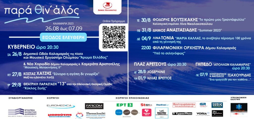 Το κορυφαίο καλλιτεχνικό γεγονός θα ξεκινήσει με τις «Μουσικές Μετακινήσεις ΙΙ» από τη Νέα Χορωδία Δήμου Καλαμαριάς & Καμεράτα Αριστοτέλης, αλλά και με το «Άρωμα Ελλάδας» από το Δημοτικό Ωδείο Καλαμαριάς της ΚΕΔΚΑ & Μουσικό Εργαστήρι Ολύμπου. Ο Κώστας Χατζής θα μας ταξιδέψει με την ξεχωριστή φωνή του στο «Σύνορα η αγάπη δε γνωρίζει», ενώ η Josephine αναμένεται να ξεσηκώσει το νεανικό κοινό. Η εθελοντική θεατρική ομάδα «Κύκλος Ζωής» θα αναδείξει μέσα από τη θεατρική παράστασή της «13» στο Κυβερνείο το μεγαλείο και τη δύναμη της αγάπης, ενώ στον ίδιο χώρο την επόμενη μέρα ο Καλαμαριώτης Θοδωρής Βουτσικάκης, με «Το πρώτο μου Τριαντάφυλλο», θα παρουσιάσει τα νέα του τραγούδια. Η Καλαμαριά αποτελεί σημαντικό σταθμό στο «Summer Tour 2023” που πραγματοποιεί το φετινό καλοκαίρι ο χαρισματικός Δήμος Αναστασιάδης. Ο Ηλίας Βρεττός θα παρουσιάσει τις μεγάλες του επιτυχίες στο μουσικό φεστιβάλ της πόλης μας.