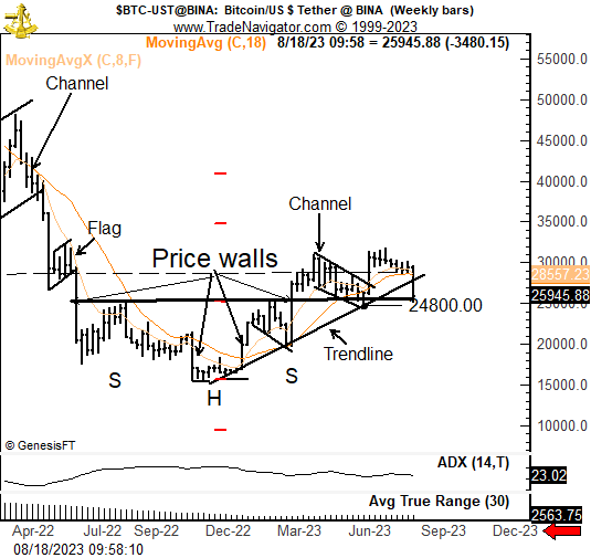 «Η πτώση στο Bitcoin για μια ακόμα φορά δοκιμάζει το επίπεδο στήριξης στην υποκείμενη ανεστραμμένη H&S. Ένα κλείσιμο κάτω από τις 24.800 μονάδες (το χαμηλό της προηγούμενης δοκιμής) θα έκανε ζημιά στο ημερήσιο και εβδομαδιαίο γράφημα. Αλλά ε, τι ξέρω εγώ; Είμαι μόνο ένας μπούμερ που ασχολείται με τα διαγράμματα».
