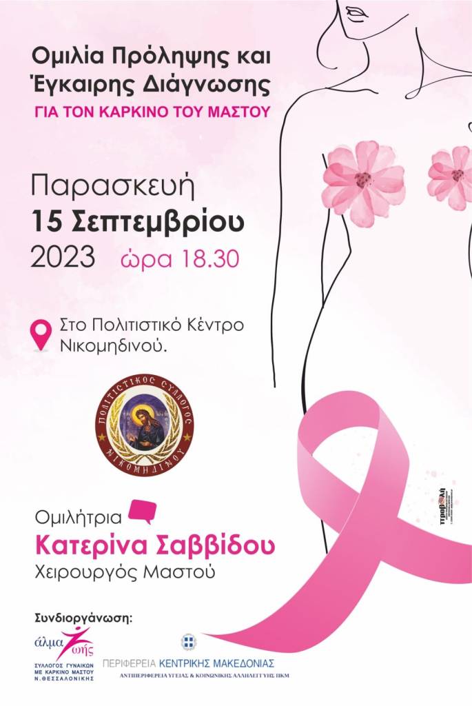 «Στο πλαίσιο ομιλιών για την ενημέρωση σχετικά με τη σπουδαιότητα της πρόληψης του Καρκίνου του Μαστού, έχουμε την ιδιαίτερη χαρά να πραγματοποιηθεί Ομιλία Πρόληψης στο Πολιτιστικό Κέντρο Νικομηδινού.