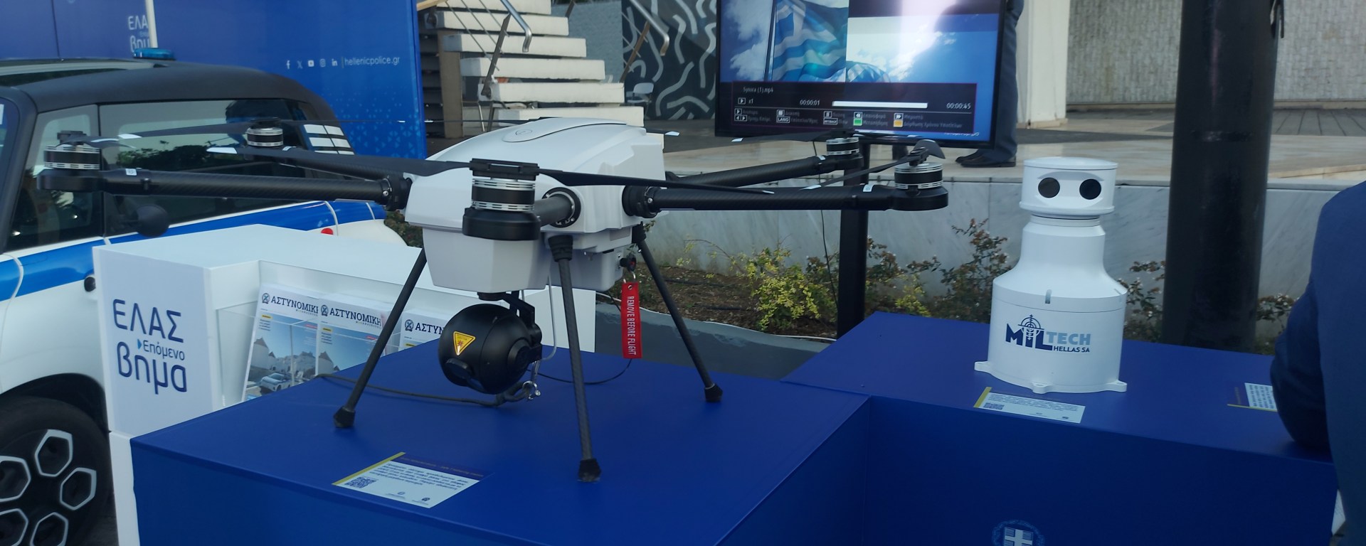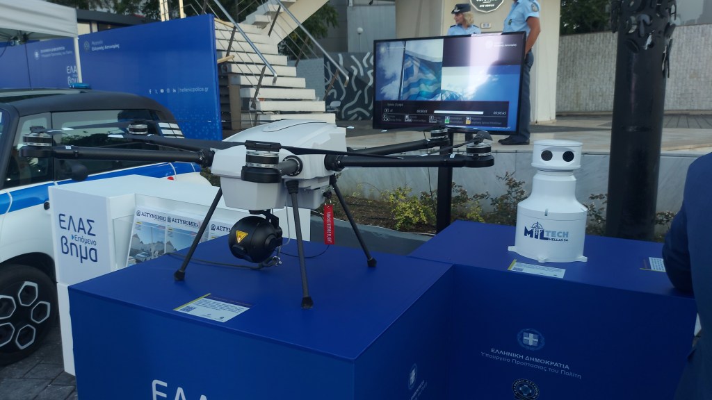 Φωτογραφία: Orion tethered drone – Safe T tethering station – «Προηγμένο σύστημα προσδεδεμένου drone. Αποτελείται από σταθμό βάσης στο έδαφος (SAFE-T) και το drone, το οποίο συνδέεται με το σταθμό μέσω καλωδίου. Παρέχει αδιάλειπτη επιτήρηση μεγάλων περιοχών».