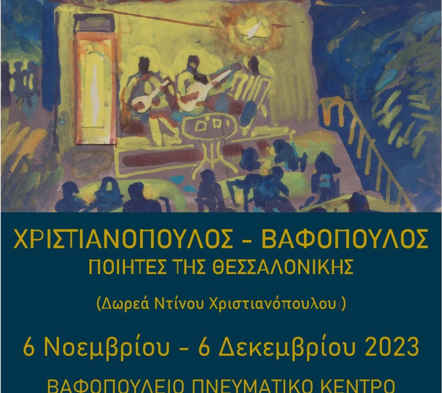 Το Βαφοπούλειο Πνευματικό Κέντρο σε συνεργασία με τη Βιβλιοθήκη και το Κέντρο Πληροφόρησης του Αριστοτελείου Πανεπιστημίου Θεσσαλονίκης διοργανώνει έκθεση με τίτλο «Χριστιανόπουλος-Βαφόπουλος. Ποιητές της Θεσσαλονίκης».