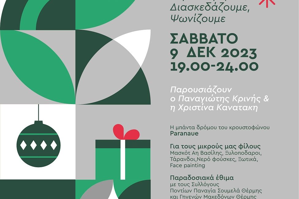 Παράλληλα οι πρόσκοποι Θέρμης θα προσφέρουν ζεστή σοκολάτα και η Ένωση Επαγγελματιών Εμπόρων Δήμου Θέρμης, κάστανα και κρασί. Διασκέδαση – χορός – τραγούδια και αγορές από τα καταστήματα που θα κάνουν «ειδικές τιμές». Με τις αποδείξεις που θα συλλέγουν οι καταναλωτές, θα έρχονται στην πλατεία όπου και θα τις καταθέτουν ώστε να μπουν στην κλήρωση που θα πραγματοποιηθεί στις 23:00 προσφέροντας σε πέντε τυχερούς από ένα μπλοκ δωροεπιταγών αξίας 100€. Το ειδικά διαμορφωμένο ωράριο της αγοράς για το Σάββατο 9 Δεκεμβρίου 2023 θα είναι από τις 19:00 έως 24:00. Το πρόγραμμα των εκδηλώσεων θα παρουσιάσουν οι δημοσιογράφοι Χριστίνα Κανατάκη και Παναγιώτης Κρινής.