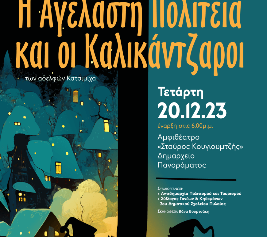 Το πολυαγαπημένο παιδικό χριστουγεννιάτικο παραμύθι των Χάρη και Πάνου Κατσιμίχα «Η Αγέλαστη Πολιτεία και οι Καλικάντζαροι» σε σκηνοθεσία της Βάνας Βουρτσάκη θα έχουν την ευκαιρία να απολαύσουν μικροί και μεγάλοι στο πλαίσιο των Χριστουγεννιάτικων εκδηλώσεων που διοργανώνει φέτος η Αντιδημαρχία Πολιτισμού και Τουρισμού του δήμου Πυλαίας-Χορτιάτη.
