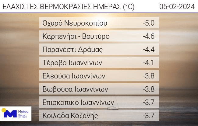 Στον πίνακα που ακολουθεί παρουσιάζονται οι 8 σταθμοί του δικτύου αυτόματων μετεωρολογικών σταθμών του meteo.gr / Εθνικού Αστεροσκοπείου Αθηνών που κατέγραψαν τις χαμηλότερες θερμοκρασίες τη Δευτέρα 05/02.