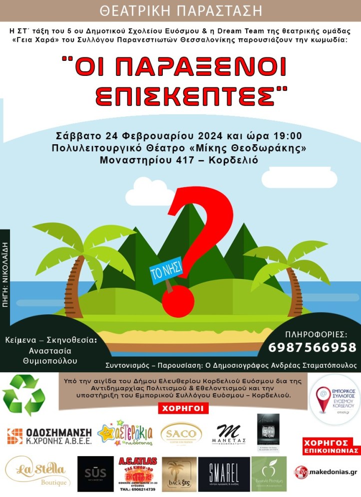 Τα παιδιά της ΣΤ τάξης του 5ου δημοτικού σχολείου Ευόσμου θέλοντας να τιμήσουν το φιλανθρωπικό έργο της θεατρικής ομάδας «Γεια Χαρά» του Συλλόγου Παρανεστιωτών Θεσσαλονίκης, ενώνονται με την “Dream Team”και παρουσιάζουν, υπό την αιγίδα του Δήμου Κορδελιού – Ευόσμου δια της Αντιδημαρχίας Πολιτισμού & Εθελοντισμού και με την υποστήριξη του Εμπορικού Συλλόγου Ευόσμου – Κορδελιού την κωμωδία «Παράξενοι Επισκέπτες».