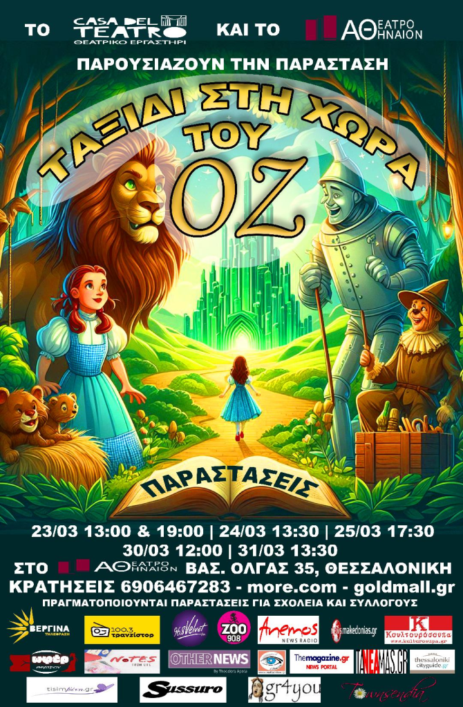 Το μαγικό ταξίδι για μικρούς και μεγάλους μετά την επιτυχημένη πρεμιέρα του στη μεγάλη σκηνή του «Κινηματοθέατρο Αθήναιον» συνεχίζει τις παραστάσεις του. Μια ιστορία βασισμένη στο διαχρονικό βιβλίο «Ο μάγος του Οζ» του Lyman Frank Baum, γεμάτη νοήματα, αξίες και συμβολισμούς.