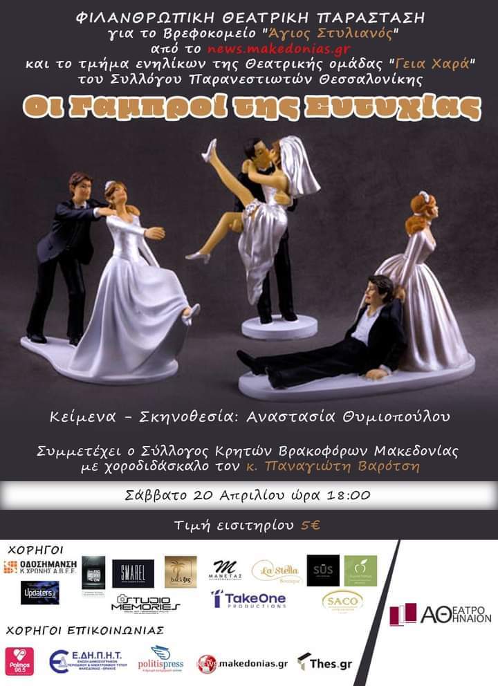 Στις 20 Απριλίου ημέρα Σάββατο και ώρα 18:00 με την Θεατρική παράσταση, “Οι Γαμπροί της Ευτυχίας”, ολοκληρώνεται η “Δράση Αγάπης” για το Βρεφοκομείο “Άγιος Στυλιανός” Θεσσαλονίκης.