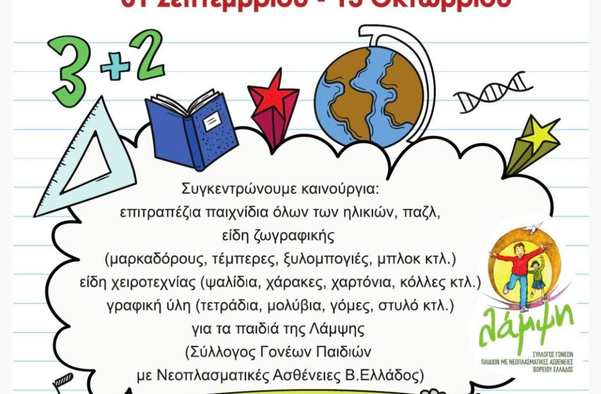 Από την 1 Σεπτεμβρίου έως και τις 13 Οκτωβρίου 2024 καλούμε μικρούς και μεγάλους να συμμετέχουν στη δράση μας προσφέροντας καινούρια επιτραπέζια παιχνίδια και παζλ για παιδιά όλων των ηλικιών, είδη ζωγραφικής (μαρκαδόρους, ξυλομπογιές, μπλοκ ζωγραφικής, νερομπογιές κτλ), είδη χειροτεχνίας (ψαλίδια, χαρτόνια, κόλλες κτλ) και είδη γραφικής ύλης τα οποία θα συλλεχθούν και θα διατεθούν στα παιδιά βρεφικής έως εφηβικής ηλικίας που στηρίζει ο σύλλογος «ΛΑΜΨΗ» και νοσηλεύονται στο Πανεπιστημιακό Γενικό Νοσοκομείο Θεσσαλονίκης «ΑΧΕΠΑ» και το Γενικό Νοσοκομείο Θεσσαλονίκης «ΙΠΠΟΚΡΑΤΕΙΟ». Σημαντικό στοιχείο της φετινής δράσης είναι ότι συλλέγονται αποκλειστικά καινούρια και όχι μεταχειρισμένα είδη, θέλοντας να ακολουθήσουμε τις οδηγίες των ιατρών και να προστατεύσουμε την υγεία των μικρών μας φίλων αποφεύγοντας την πιθανή μετάδοση μικροοργανισμών που θα μπορούσαν να την επιβαρύνουν.