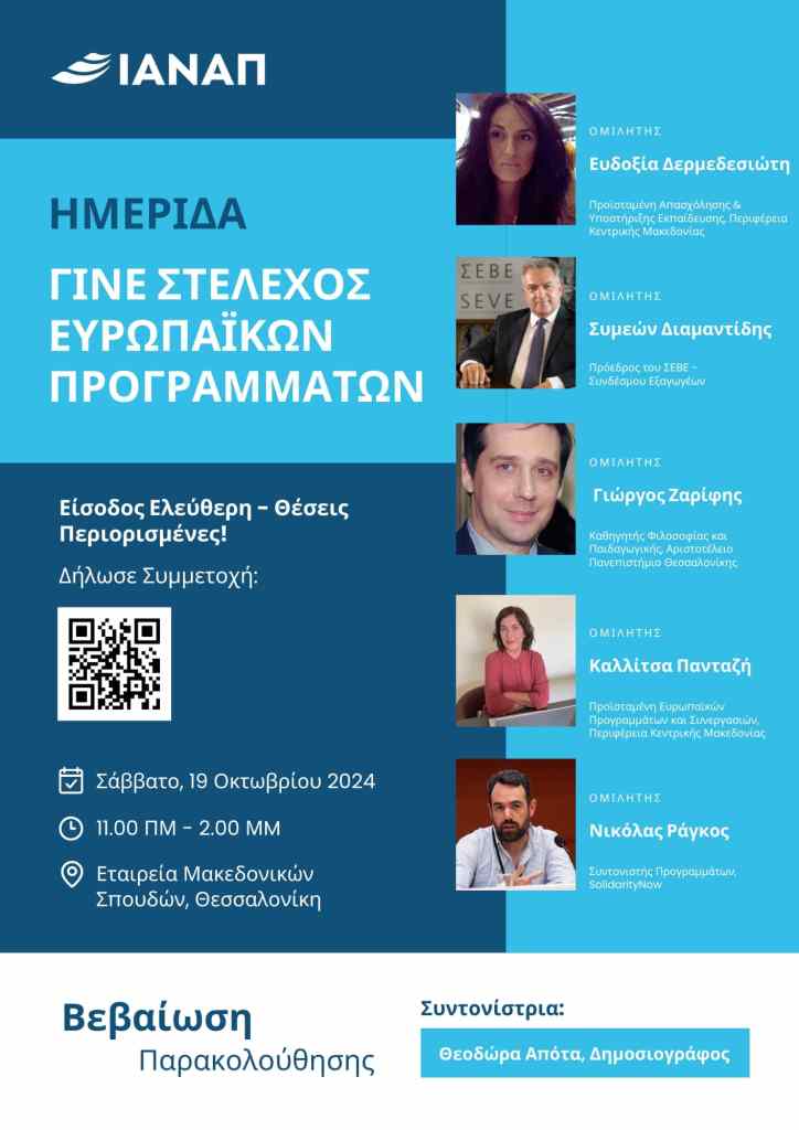 Το Ινστιτούτο Ανάπτυξης Απασχόλησης έχει την τιμή να ανακοινώσει τη διοργάνωση της ημερίδας με τίτλο «Γίνε στέλεχος ευρωπαϊκών προγραμμάτων – Απογείωσε τις προοπτικές σου».