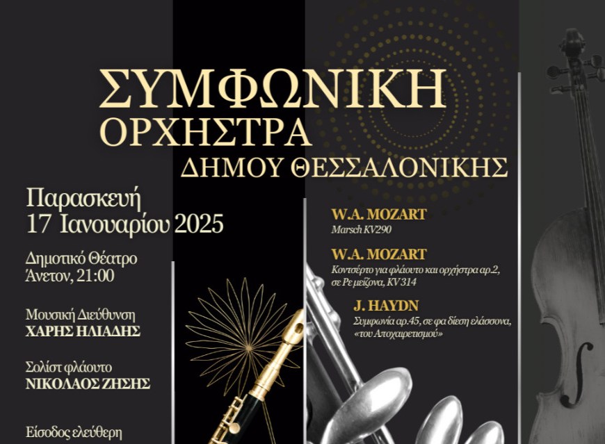 Η Συμφωνική Ορχήστρα Δήμου Θεσσαλονίκης παρουσιάζει την εναρκτήρια συναυλία της για το 2025, με τρία αριστουργηματικά έργα από τους W.A. Mozart (1756 – 1791) και J. Haydn (1732 – 1809).