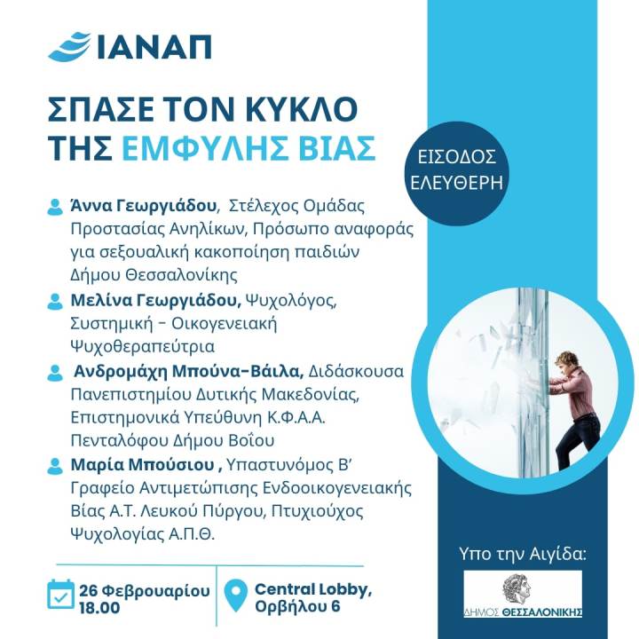 Το Ινστιτούτο Ανάπτυξης Απασχόλησης έχει την τιμή να σας προσκαλέσει στην ημερίδα με τίτλο «Σπάσε τον Κύκλο της Έμφυλης Βίας», που θα πραγματοποιηθεί την Τετάρτη, 26 Φεβρουαρίου 2025, από τις 18:00 έως τις 20:00, στην αίθουσα του Central Lobby, Ορβήλου 6 (περιοχή Λαδάδικα), υπό την αιγίδα του Δήμου Θεσσαλονίκης.