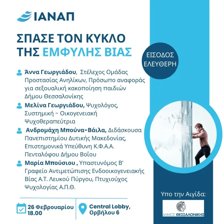 Η παρουσία όλων είναι σημαντική για να συμβάλουμε μαζί στη διαμόρφωση μιας κοινωνίας χωρίς έμφυλη βία. Σας περιμένουμε την Τετάρτη, 26 Φεβρουαρίου 2025, από τις 18:00 έως τις 20:00, στην αίθουσα του Central Lobby, Ορβήλου 6 (περιοχή Λαδάδικα).