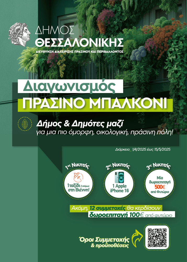 Ο Δήμος Θεσσαλονίκης, μέσω της Διεύθυνσης Διαχείρισης Πρασίνου και Περιβάλλοντος, ανακοινώνει την έναρξη του διαγωνισμού «Πράσινο Μπαλκόνι», καλώντας όλους τους κατοίκους της πόλης να συμμετάσχουν σε αυτή την πρωτοβουλία για μια πιο πράσινη και όμορφη Θεσσαλονίκη.