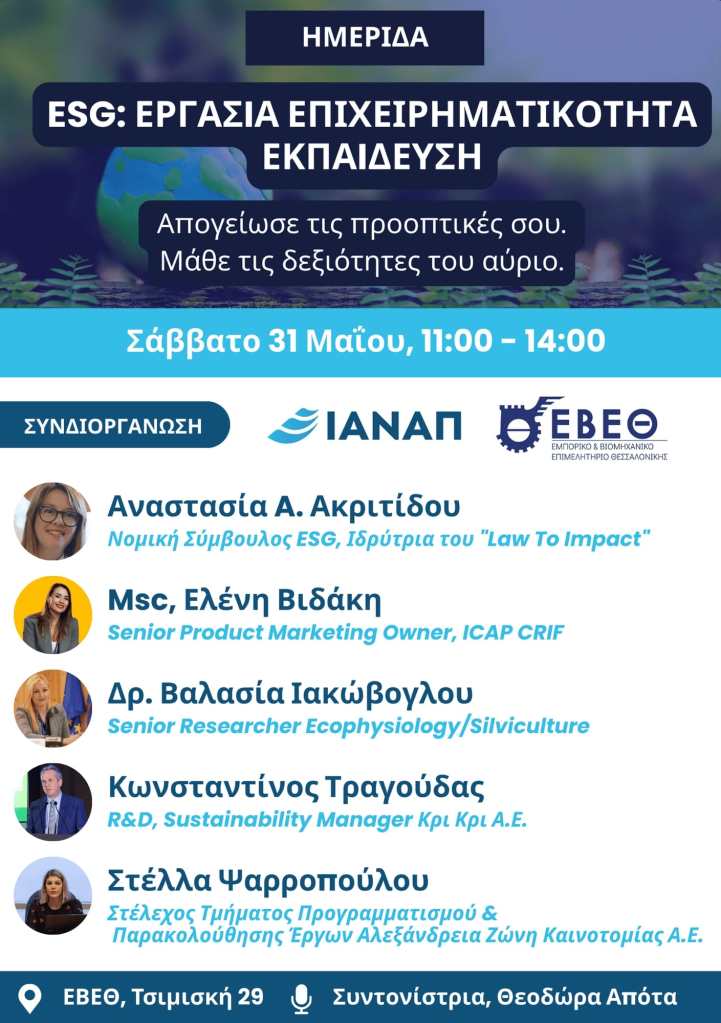 Το Ινστιτούτο Ανάπτυξης Απασχόλησης σε συνεργασία με το Εμπορικό και Βιομηχανικό Επιμελητήριο Θεσσαλονίκης συνδιοργανώνουν ημερίδα με τίτλο «ESG: Εργασία, Επιχειρηματικότητα, Εκπαίδευση – Απογείωσε τις προοπτικές σου. Μάθε τις δεξιότητες του αύριο», που θα πραγματοποιηθεί το Σάββατο, 31 Μαΐου 2025, από τις 11:00 έως τις 14:00, στην αίθουσα εκδηλώσεων του Επιμελητηρίου (ΕΒΕΘ), Τσιμισκή 29.