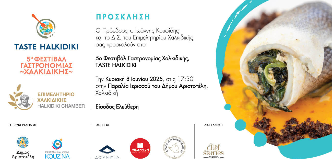Το Επιμελητήριο Χαλκιδικής συνεχίζοντας την διοργάνωση που καθιέρωσε από το 2021, ανακοινώνει τη διοργάνωση του 5ου Φεστιβάλ Γαστρονομίας Χαλκιδικής, TASTE HALKIDIKI, που θα πραγματοποιηθεί την Κυριακή 8 Ιουνίου, στην Παραλία της Ιερισσού, σε συνεργασία με το δήμο Αριστοτέλη και το πρόγραμμα KOUZINA.