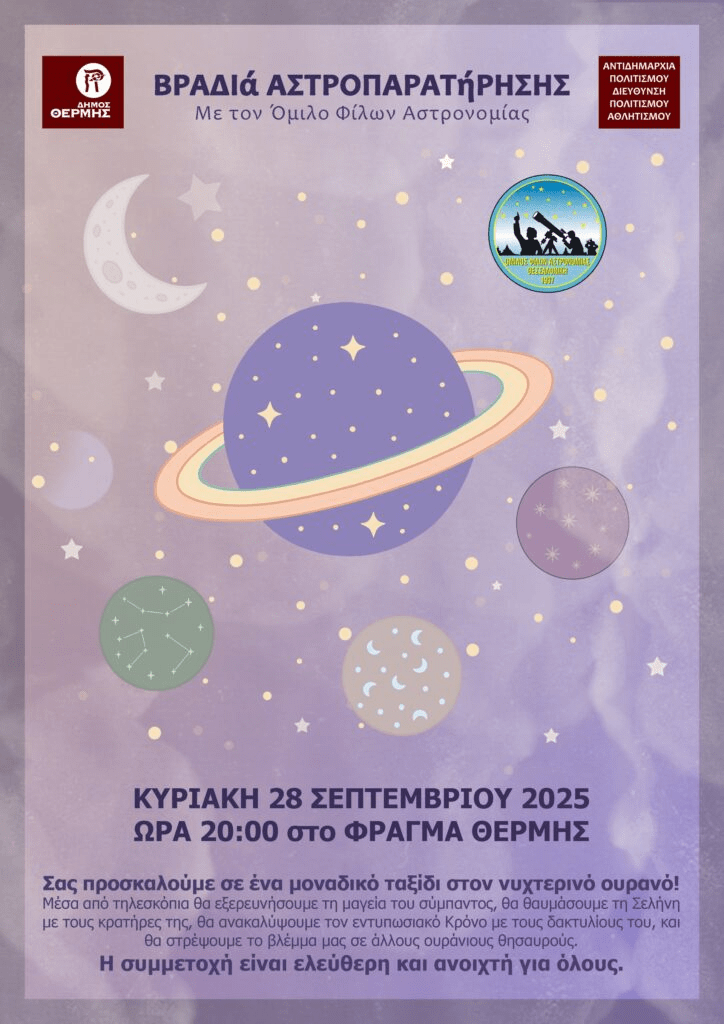 Ο Δήμος Θέρμης, δια της Αντιδημαρχίας Πολιτισμού σε συνεργασία με τον Όμιλο Φίλων Αστρονομίας προσκαλούν μικρούς και μεγάλους σε ένα μοναδικό ταξίδι στον νυχτερινό ουρανό την Κυριακή 28 Σεπτεμβρίου 2025, και ώρα 20:00, στο Φράγμα Θέρμης.