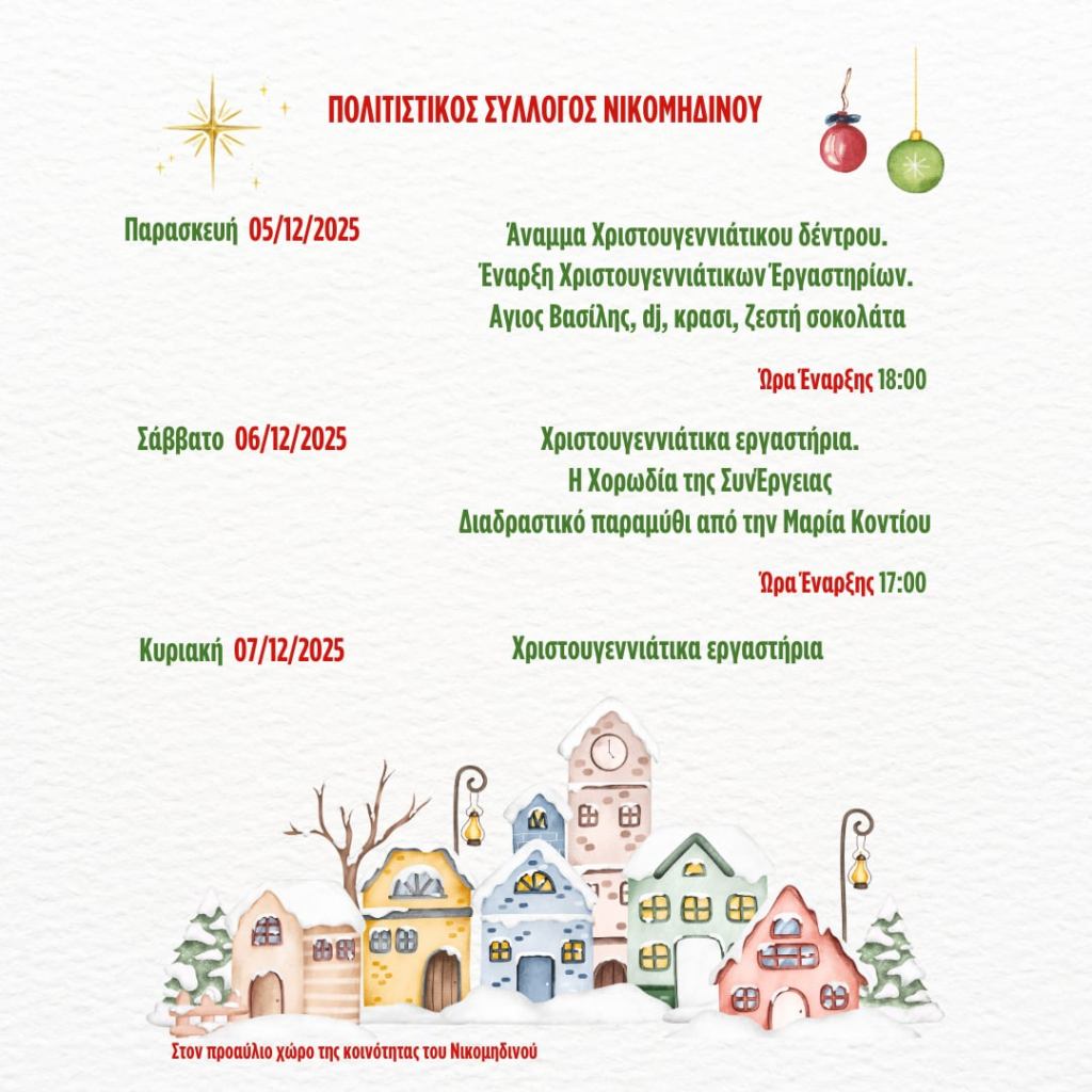 Την Κυριακή 7/12 θα συνεχιστούν τα χριστουγεννιάτικα εργαστήρια στον προαύλιο χώρο της κοινότητας Νικομηδινού, όπως ενημερώνει ο Πολιτιστικός Σύλλογος της περιοχής.